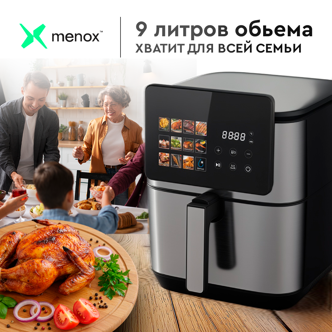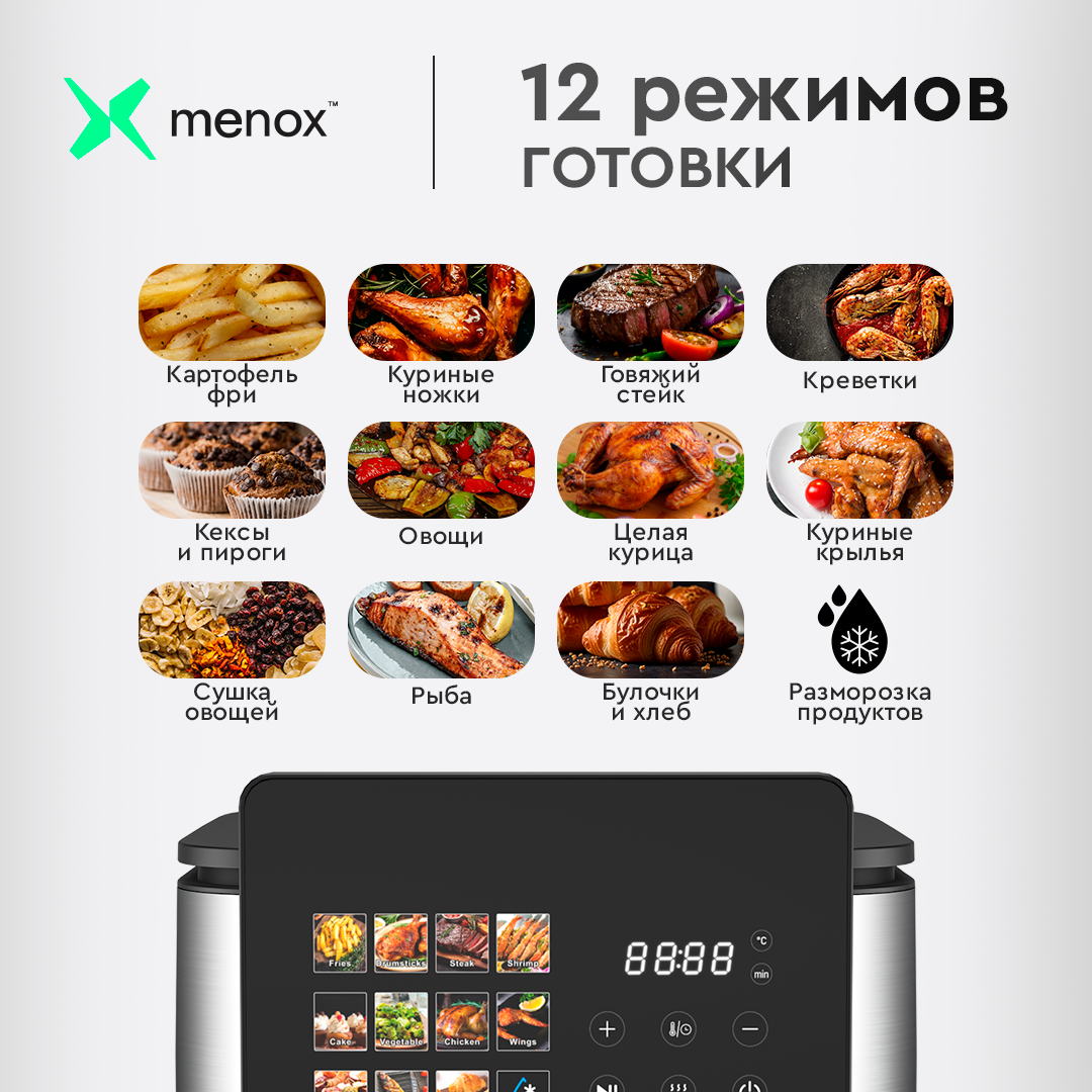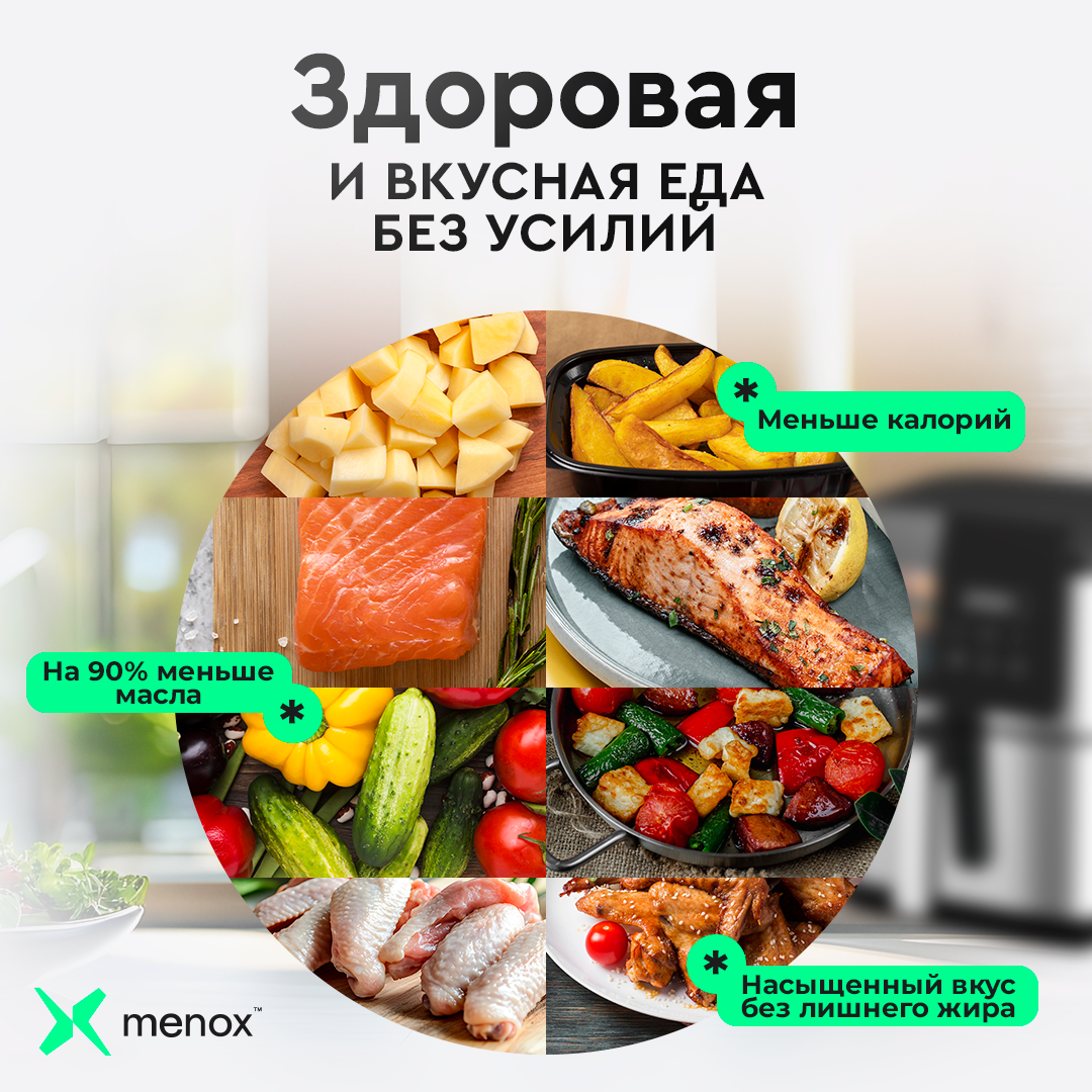 Menox AG-01 — современный многофункциональный аэрогриль для быстрого и полезного приготовления блюд. Высокая мощность, равномерная циркуляция горячего воздуха и автоматические программы позволяют готовить вкусно, быстро и без использования масла.