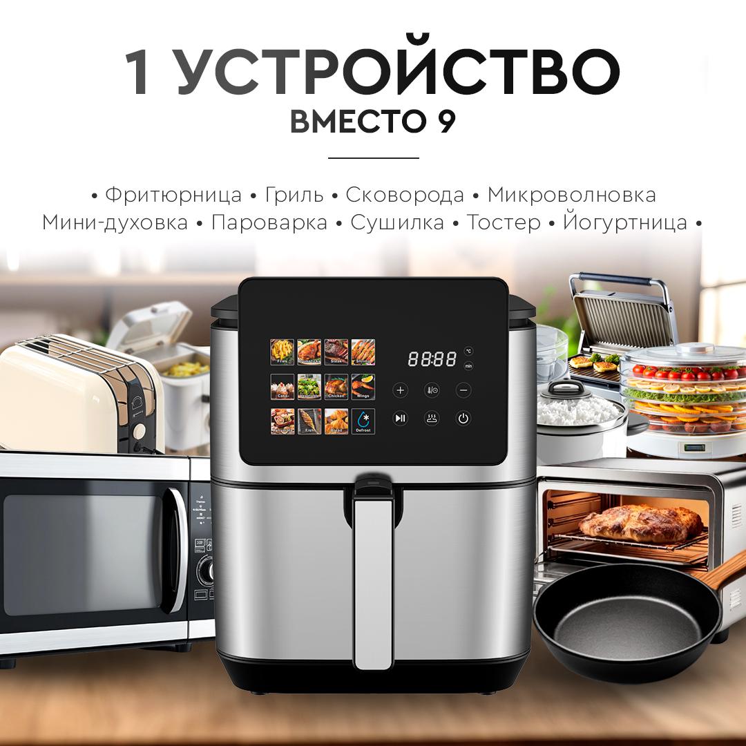 Аэрогриль оснащён 12 автоматическими программами, которые подходят для приготовления мяса, курицы, рыбы, овощей, выпечки, картофеля фри, сушки фруктов и разморозки продуктов.