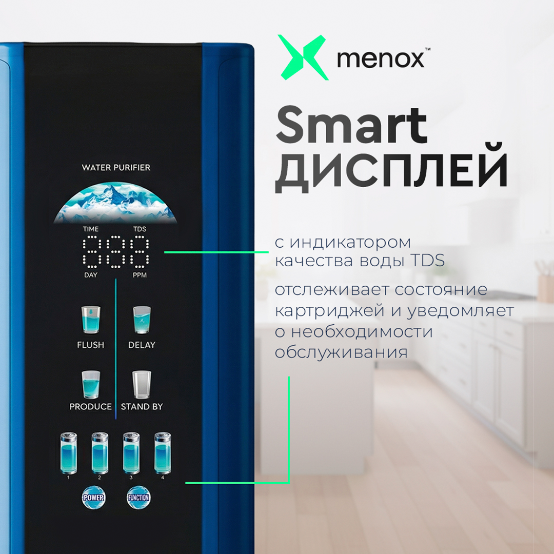 Smart LED-дисплей отображает уровень TDS, контролирует ресурс картриджей и своевременно напоминает о необходимости обслуживания.