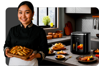 Быстрая циркуляция воздуха создаёт аппетитную корочку без масла, делая еду легче и здоровее.